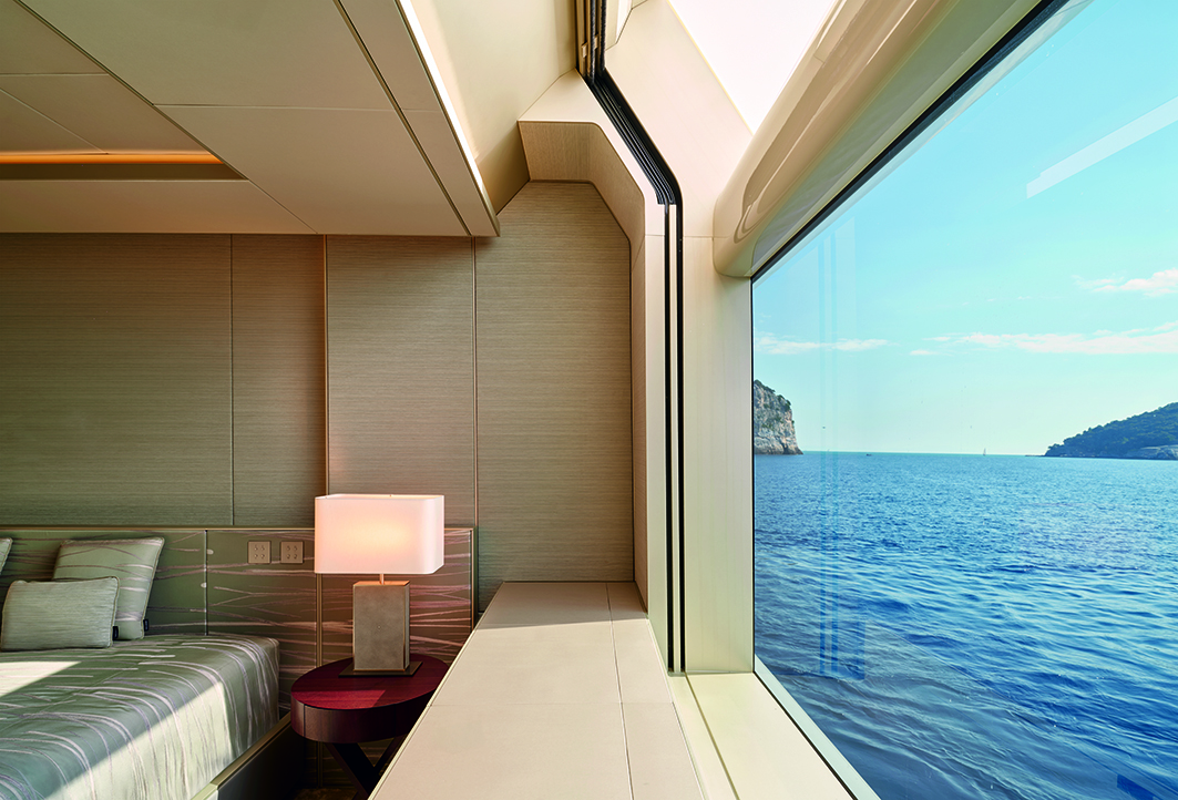 The master suite functions as a private sanctuary, open to the horizon yet ensuring complete discretion. Guest cabins feature inclined geometries and large glazed surfaces, enhancing natural light and reinforcing the constant connection with the sea.